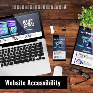 Workspace with devices displaying web design content and "Website Accessibility" text banner.